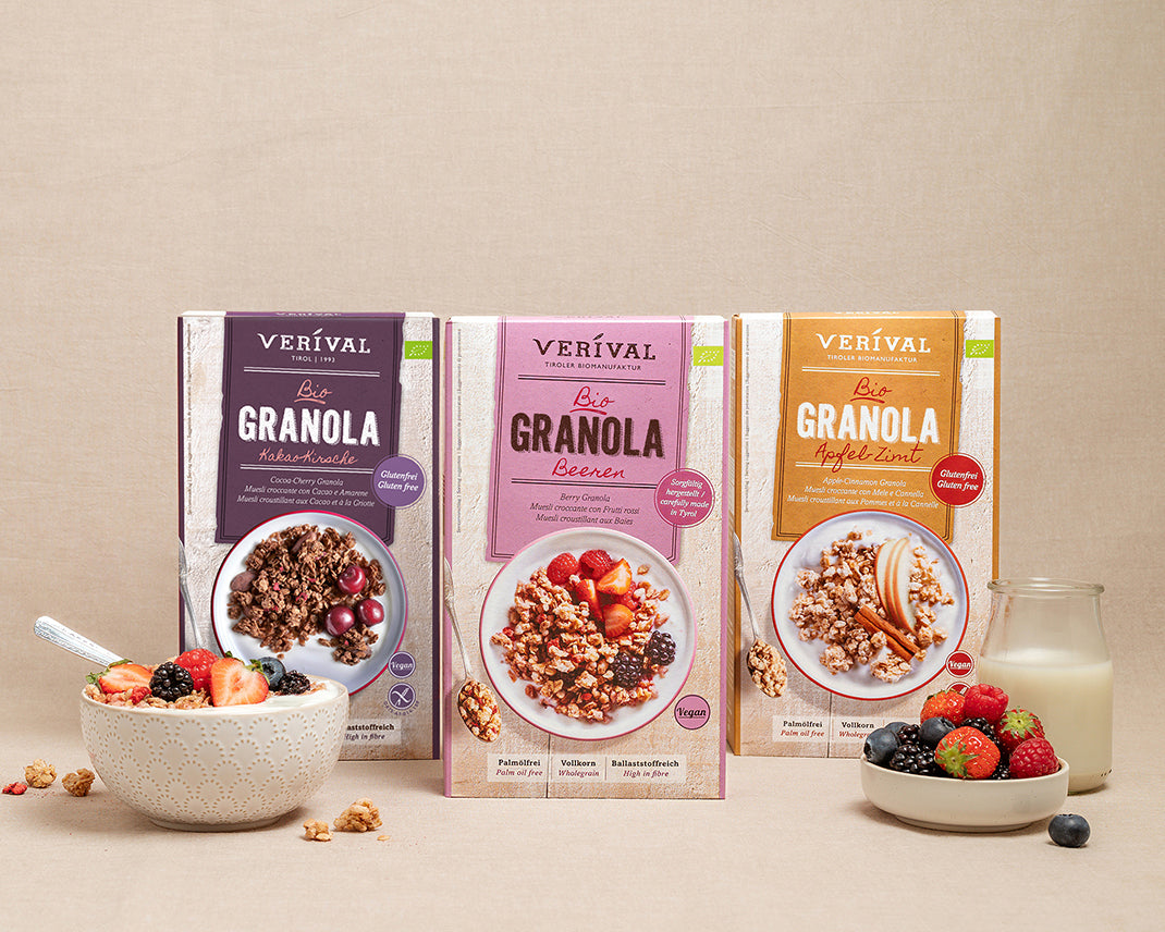 Jedes Granola Müsli wird in Tirol handgefertigt, wobei wir sparsam süßen, um den natürlichen Geschmack zu bewahren. Alle Verival Granolas sind direkt bei Verival online erhältlich.